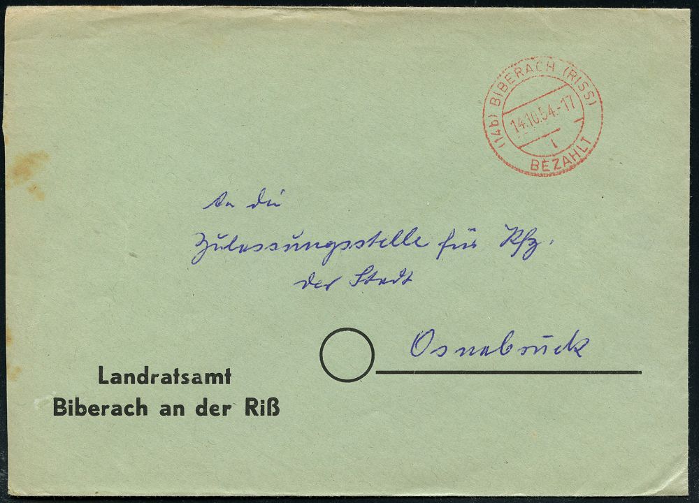 5939 | 8 € | POSTLEITRAUM 7900 (OHNE ULM) : (14b) BIBERACH (RISS)/ l/ BEZAHLT 1954 (14.10.) 2K-Steg-PFS ohne Wertziffer mit Uhrzeit auf Dienst-Bf.: Landratsamt Biberach.. (Dü.A-7, Nr.32) | ![]() | |