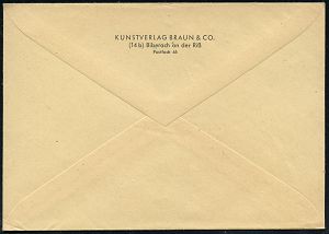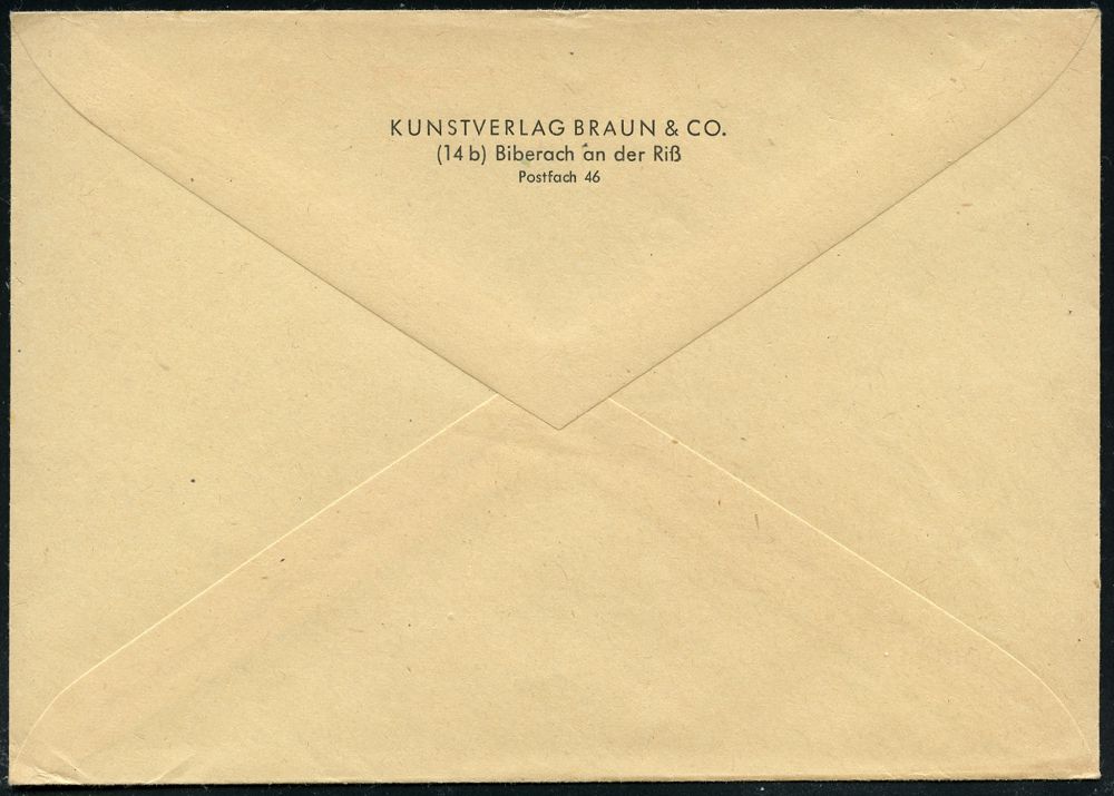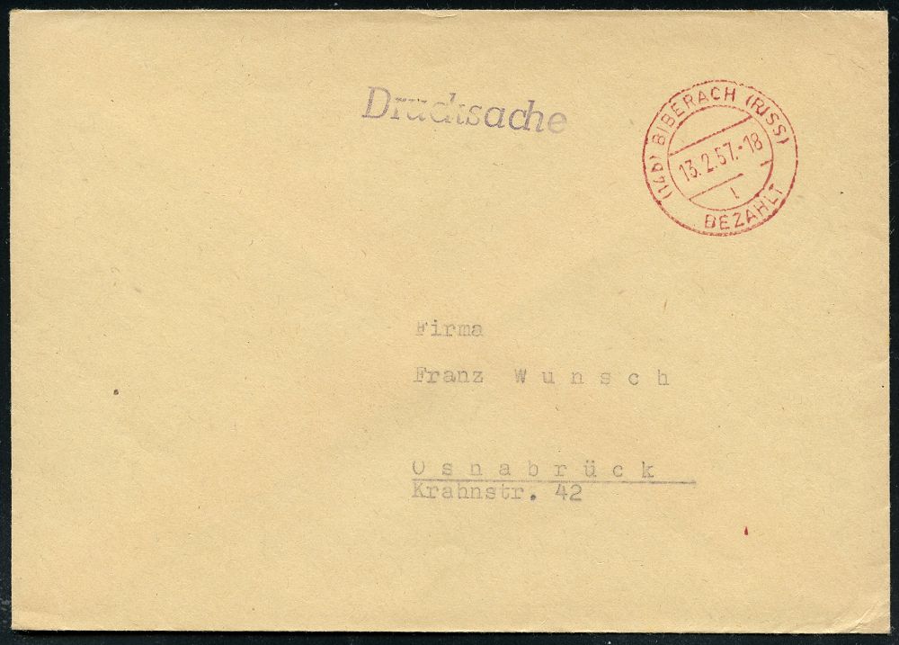 5940 | 8 € | POSTLEITRAUM 7900 (OHNE ULM) : (17b) BIBERACH (RISS)/ l/ BEZAHLT 1957 (13.2.) 2K-Steg-PFS ohne Wertziffer mit Uhrzeit , rs. Abs.-Vordruck: KUNSTVERLAG BRAUN & CO.. (Dü.A-7, Nr.32) | ![]() ![]() | |