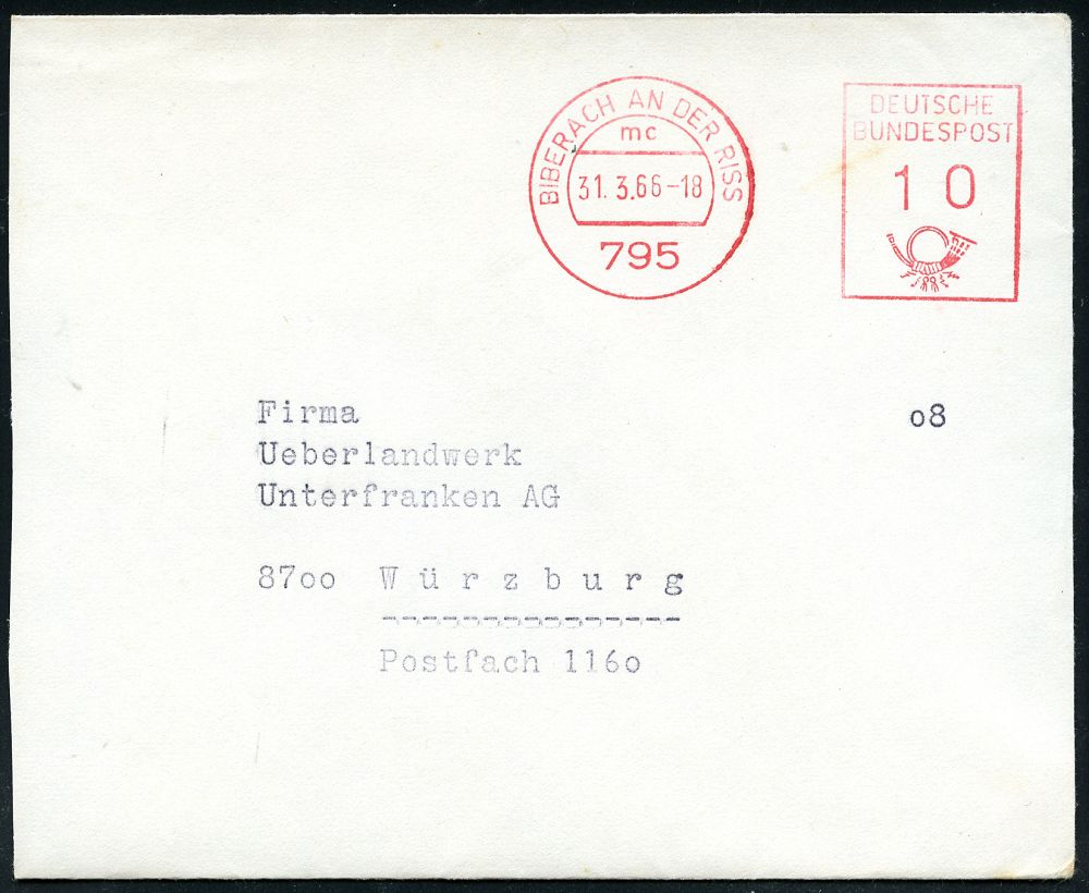 5941 | 5 € | POSTLEITRAUM 7900 (OHNE ULM) : 795 BIBERACH AN DER RISS(mc/ DEUTSCHE/ BUNDESPOST 1966 (31.3.) PFS Posthorn 10 Pf. (links verkürzter) Fern-Bf. (Dü.D-17) | ![]() | |