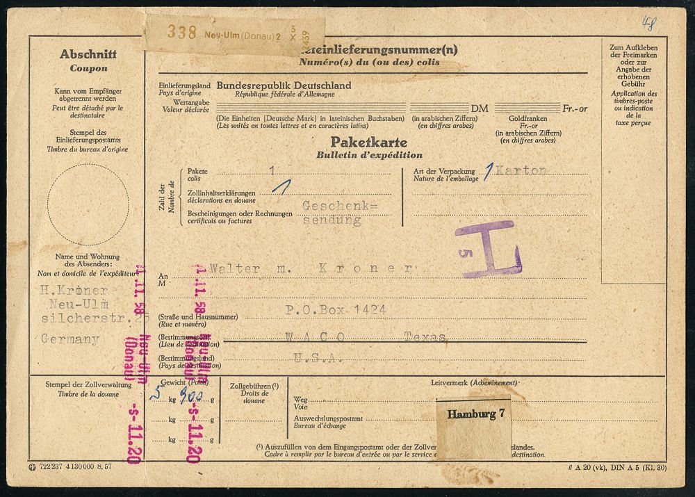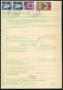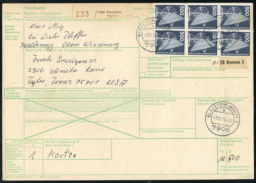 5949 | 18 € | POSTLEITRAUM 7900 (OHNE ULM) : 7906 BLAUSTEIN,WÜRTT 1/ a 1976 (7.12.) 1K-Segment mehrfach auf 6er-Block 500 Pf. Radioteleskop (u. weitere Frankatur) + brauner Paketzettel: 7906 Blaustein, / Württ 3 + Leitzettel: 28 Bremen 5, klar gest. Übersee-Paket-Kt. n. U.S.A., seltene Portostufe 4210 Pf.! (Mi.859 8x u.a.) | ![]() ![]() | |