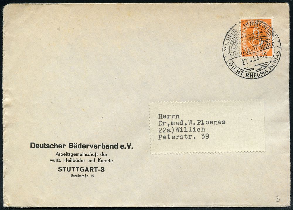5952 | 10 € | POSTLEITRAUM 7900 (OHNE ULM) : (14b) BUCHAU AM FEDERSEE/ MOORBAD HEILT/ GICHT,RHEUMA.. 1953 (27.4.) HWSt (Landungsbrücke) Vordruck-Bf: Deutscher Bäderverband e.V... Stuttgart (Bo.3) | ![]() | |