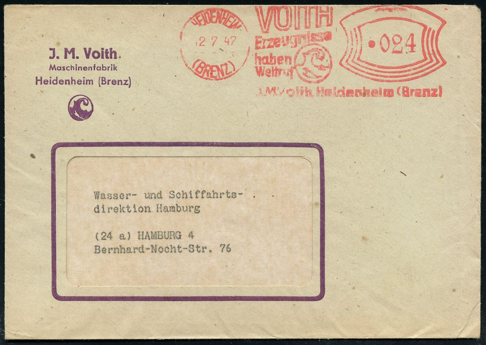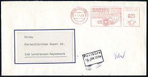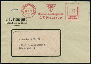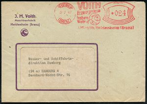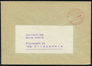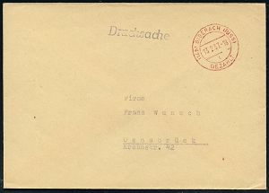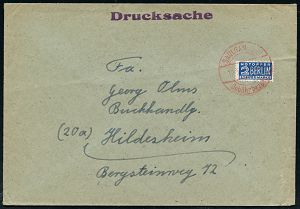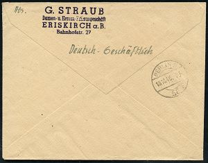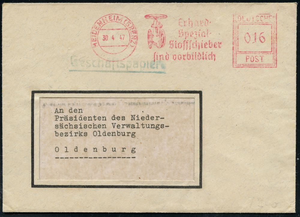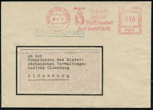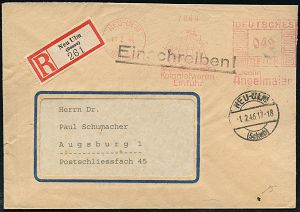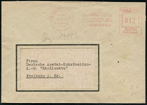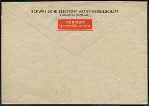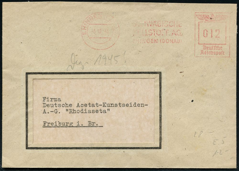 5955 | 20 € | POSTLEITRAUM 7900 (OHNE ULM) : EHINGEN (DONAU)/ SCHWÄBISCHE/ ZELLSTOFF AG.. 1945 (5.12.) aptierter AFS Francotyp "Reichsadler" u n v e r ä d e r t weiterverwendet = Notmaßname! (zeitbedingt etw. schwach) rs. Abs.-Vordruck + rotes Label; GERMAN GESCHÄFTLICH, Fern-Bf. (Dü.E-5cg, unverändert !) | ![]() ![]() | |