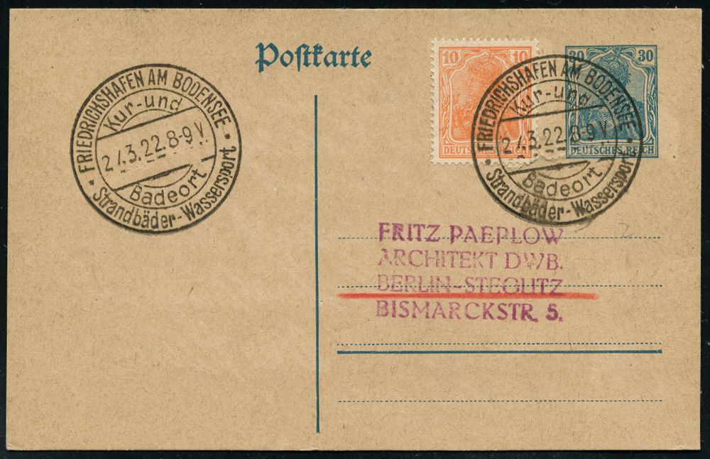 5959 | 16 € | POSTLEITRAUM 7900 (OHNE ULM) : FRIEDRICHSHAFEN AM BODENSEE/ Strandbäder-Wassersport 1922 (27.3.) HWSt , klar gest. Infla-P 30 Pf. Germania + 10 Pf. Zusatzfrakatur (Bo.2 , Erstjahr!) | ![]() | |