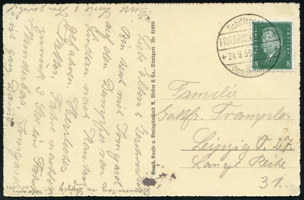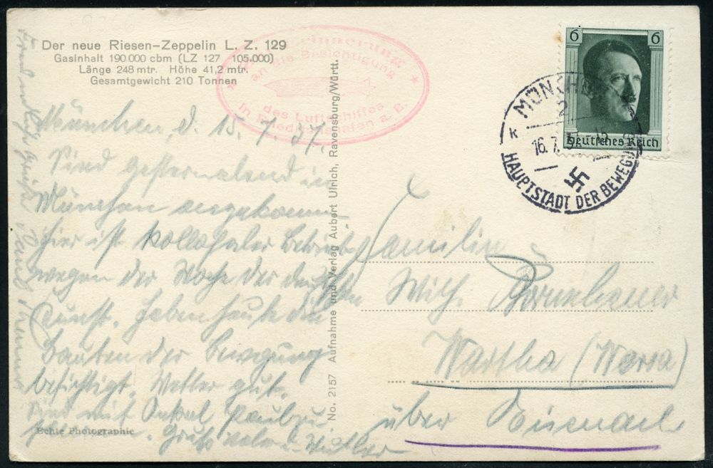 5965 | 18 € | POSTLEITRAUM 7900 (OHNE ULM) : Friedrichshafen 1937 (16.7.) s/w.-Foto-Ak.: Luftschiffwerft mit Zeppelin LZ 129 "Hindenburg" + roter Oval-HdN: , EF 6 Pf. Hitler (gest. München) Bedarf (Mi.646, EF + 7.- EUR) | ![]() ![]() | |
