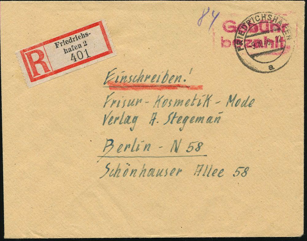 5975 | 15 € | POSTLEITRAUM 7900 (OHNE ULM) : FRIEDRICHSHAFEN/ a 1946 (9.10.) 2K-Steg + roter 2L: Gebühr/bezahlt (Antiqua) + RZ: Friedrichs-/hafen 2, Fern-R-Bf. (n. Ostberlin) | ![]() ![]() | |