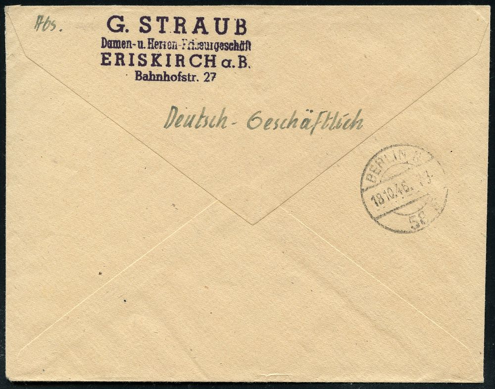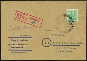 6145 | 16 € | POSTLEITRAUM 7900 (OHNE ULM) : WEISSENHORN/ historisch-waldreich 1947 (31.3.) HWSt auf EF 84 Pf. Landarbeiter + roter R - S t e m p e l: (13 b) Weißenhorn + hs. Nr. , Firmen-Fern-R-Bf. n. Ecking (Mi.958 EF + 15.- EUR) | ![]() | |