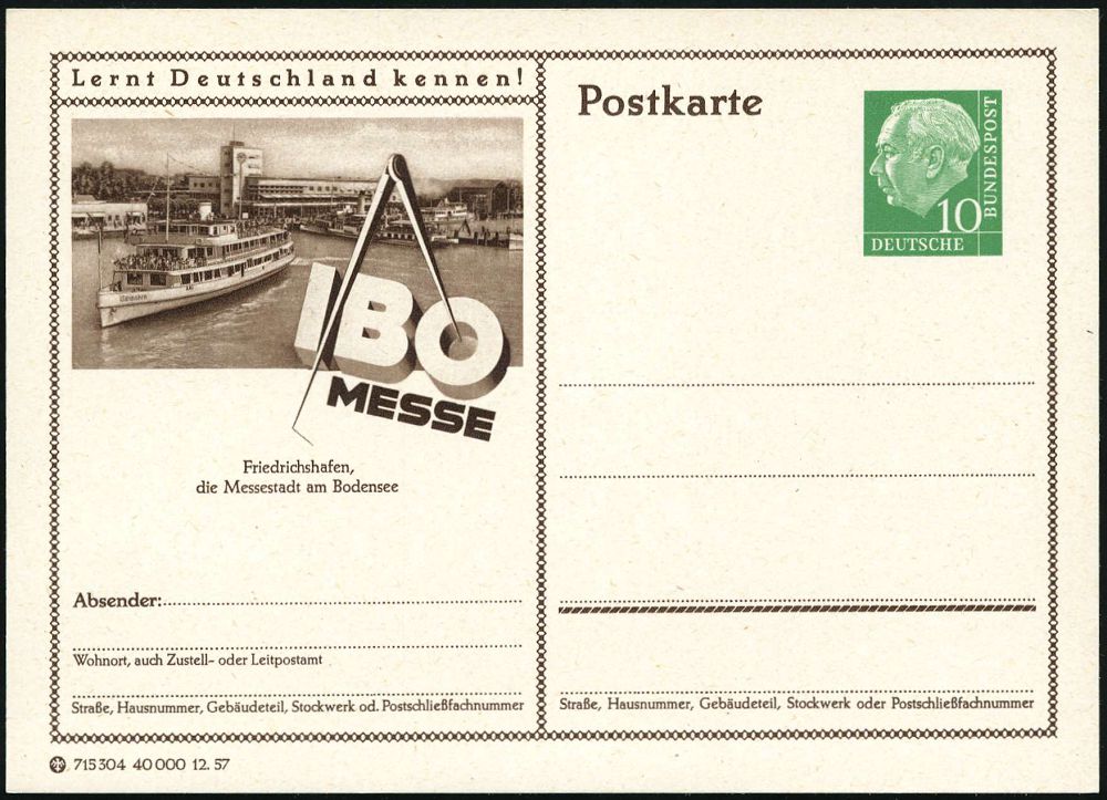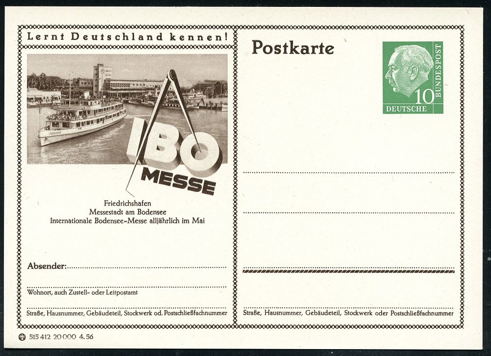 5976 | 18 € | POSTLEITRAUM 7900 (OHNE ULM) : Friedrichshafen 1956/57 10 Pf. BiP Heuss I, 3 verschiedene: IBO-Messe = Schiffs-Bahnhof m. MS. "Schwaben" (+ Zirkel) je ungebr. (Einzelverkauf möglich: je 7.- EUR) 3 Belege (Mi.P 24/0197, 0242, 0300) | ![]() ![]() ![]() | |