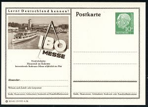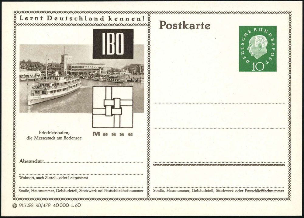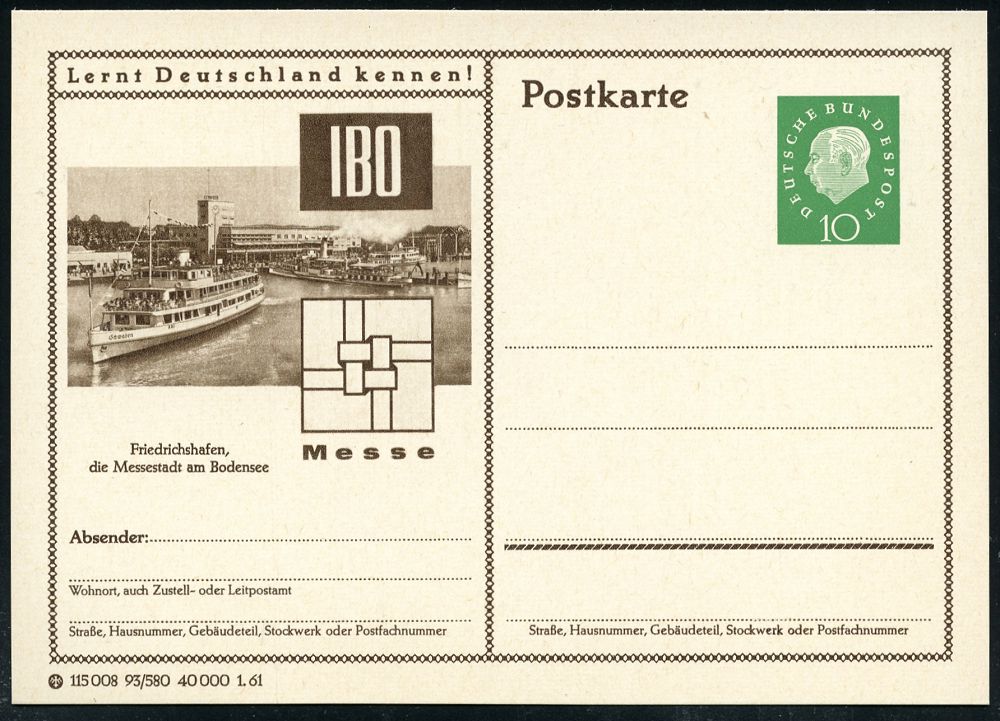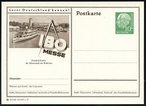 5980 | 12 € | POSTLEITRAUM 7900 (OHNE ULM) : Friedrichshafen 1960/61 10 Pf. BiP Heuss III, 2 verschied.: IBO Messe = Schiffs-Bahnhof + MS. "Schwaben" (+ Messe-Logo) je ungebr. (Einzelverkauf möglich: je 7.- EUR) 2 Belege (Mi.P 42-80/479, P 53-93/580) | ![]() ![]() | |