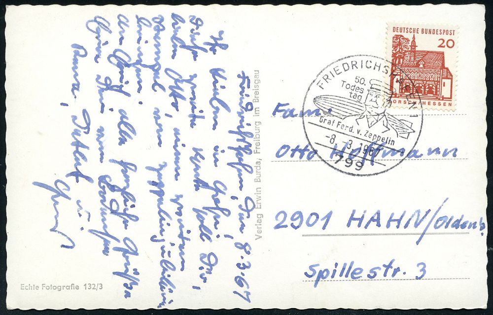 5986 | 12 € | POSTLEITRAUM 7900 (OHNE ULM) : 799 FRIEDRICHSHAFEN 1/ 750./ Todes/ tag/ Graf Ferd.v.Zeppelin 1967 (8.3.) SSt (Graf Zeppelin/Luftschiff) auf s/w.-Foto-Ak.: Feriengrüße..aus Jmmenstaad, Bedarf (Bo.31, nur am 8.3.) | ![]() ![]() | |