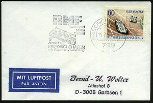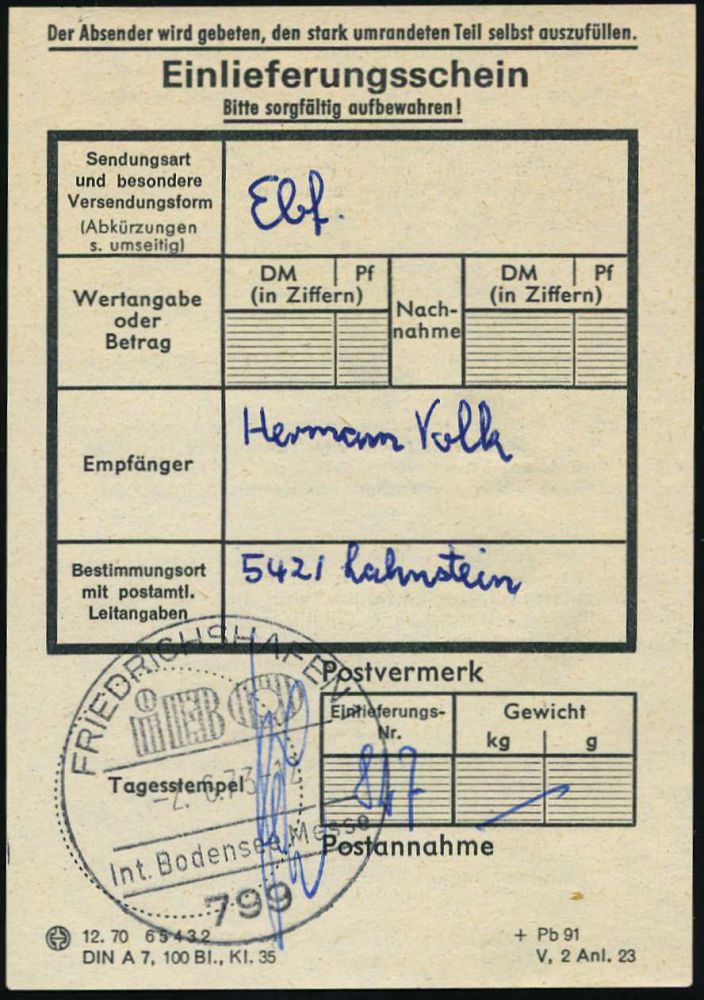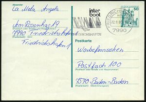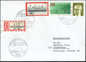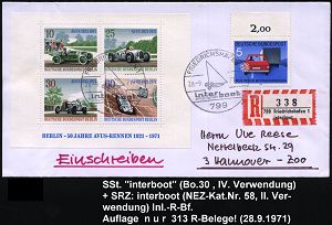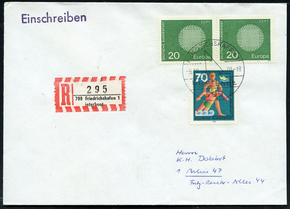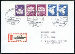 5990 | 25 € | POSTLEITRAUM 7900 (OHNE ULM) : 799 FRIEDRICHSHAFEN 1/ interboot 1970 (6.10.) SSt + Sonder-RZ: 799 Friedrichshafen 1/ interboot (NEZ-Kat. Nr.581, I. Verwendung) Inl.-R-Bf., Aufl. nur 307 Belege insges. (Bo.30) | ![]() | |