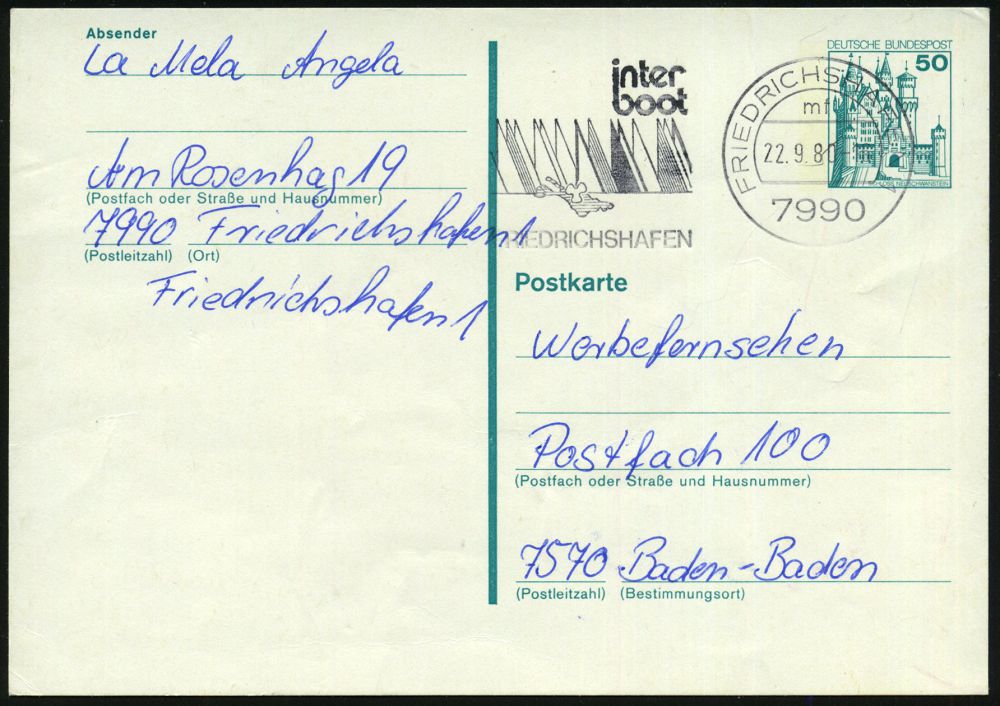 5999 | 5 € | POSTLEITRAUM 7900 (OHNE ULM) : 7990 FRIEDRICHSHAFEN 1/ mf/ inter/ boot 1980 (22.9.) MWSt = stilis. Segel (Schiffsschraube etc.) Bedarfs-Kt. | ![]() | |