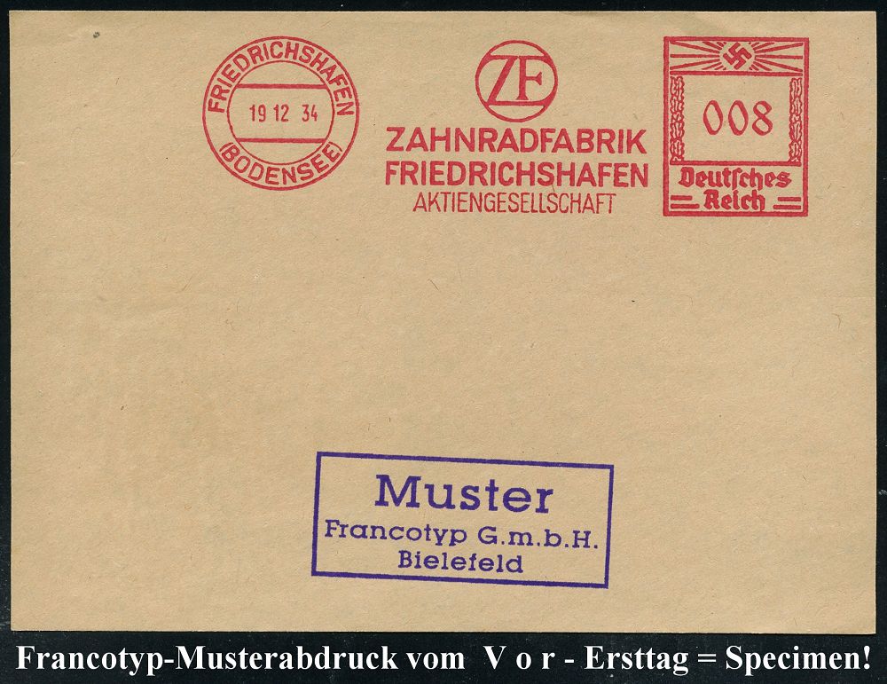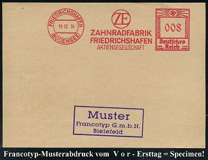 5961 | 35 € | POSTLEITRAUM 7900 (OHNE ULM) : FRIEDRICHSHAFEN/ (BODENSEE)/ ZE/ ZAHNRADFABRIK.. 1934 (19.12.) AFS-Musterabdruck Francotyp "Hakenkreuz" (Monogr.-Logo) glasklar gest. Francotyp-Musterblatt mit V o r - Ersttag ! (mit Attest), selten! (Dü.E-3CEo) | ![]() ![]() | |