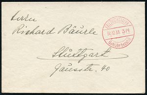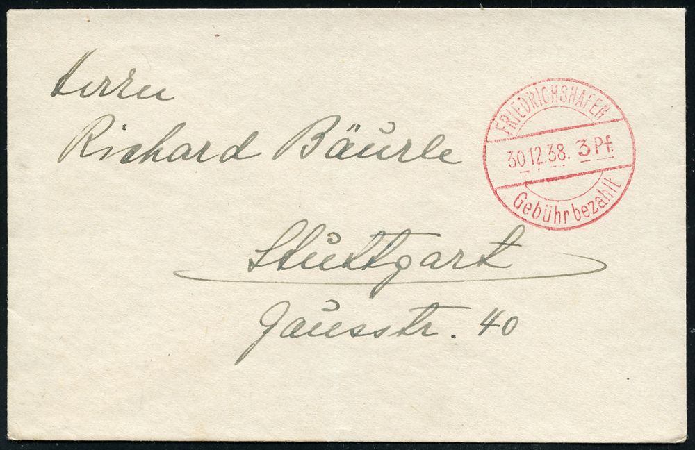 5967 | 10 € | POSTLEITRAUM 7900 (OHNE ULM) : FRIEDRICHSHAFEN/ Gebühr bezahlt 1938 (30.12.) 1K-Brücken-PFS 3 Pf. auf Miniatur-Bf. n. Stuttgart (Dü.A-6, Nr.25) | ![]() | |
