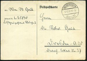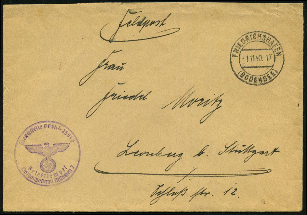5968 | 30 € | POSTLEITRAUM 7900 (OHNE ULM) : FRIEDRICHSHAFEN/ (Bodensee) 2 #bzw.# FRIEDRICHSHAFEN/ (BODENSEE) 1939/40 1K-Brücke bzw. 2K-Steg bzw. 3x stum-me 1K-Brücke = Tarnstempel Friedrichshafen , 1x hs. Abs.: "l 25890 Luftgaupostamt München 2" bzw. viol. 1K-HdN: Dienststelle FP Nr. L 26639/ Luftgaupostamt München 2 = Res. Flak Abtlg. 351, 1 Feldpost-Kt. u. 4 Feldpost-Briefe, 5 Belege | ![]() ![]() ![]() ![]() | |