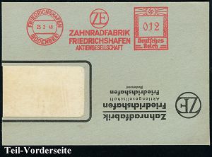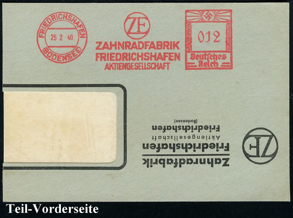 5969 | 15 € | POSTLEITRAUM 7900 (OHNE ULM) : FRIEDRICHSHAFEN/ (BODENSEE)/ ZE/ ZAHNRADFABRIK.. 1940 (25.2.) AFS Francotyp "Hakenkreuz" (Monogr.-Logo) motivgl. Firmen-Teil-Vorderseite, vergl. Kat,-Nr.5961 (Dü.E-3CEo) | ![]() | |