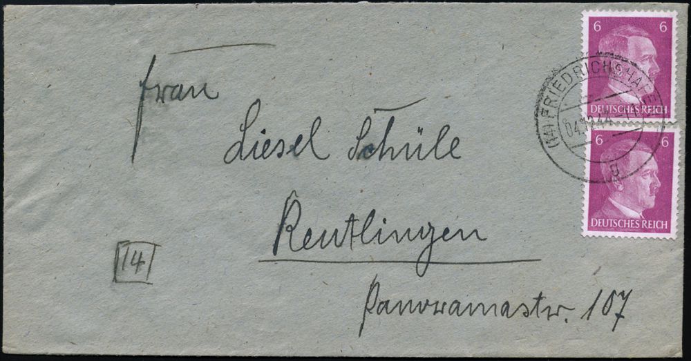 5972 | 16 € | POSTLEITRAUM 7900 (OHNE ULM) : (14) FRIEDRICHSHAFEN2/ g 1944 (4.12.) 2K-Steg auf 2x 6 Pf. Hitler , kleiner relativ später Fernbf. nach (14) Reutlingen (Mi.785 MeF) | ![]() | |