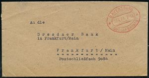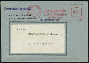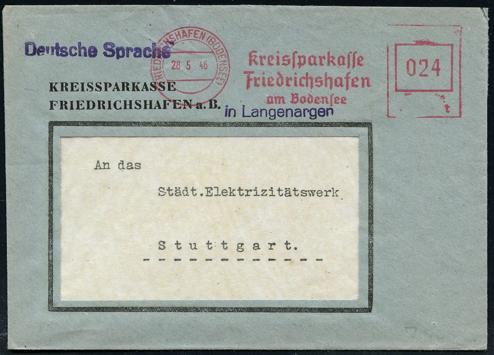 5974 | 25 € | POSTLEITRAUM 7900 (OHNE ULM) : FRIEDRICHSHAFEN (BODENSEE)/ Kreissparkasse.. 1946 (28.5.) aptierter AFS Francotyp "Reichsadler" = entfernt + Inschrift "Deutsche Reichspost" = Notmaßnahme! , Firmen-Fern-Bf. mit Zusatz "in Langenargen" (Dü.E-13-AK-129o) | ![]() | |