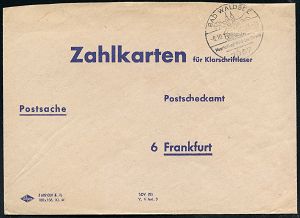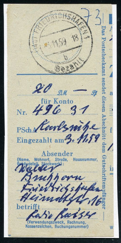 5977 | 14 € | POSTLEITRAUM 7900 (OHNE ULM) : (17b) FRIEDRICHSHAFEN 1/ b/ Bezahlt 1959 (3.11.) schwarzer 2K-Steg-PFS auf Zahlkarenabschnitt (Dü.A-7, Nr.34 schwarz) | ![]() | |