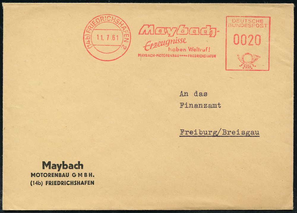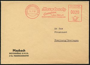 5981 | 16 € | POSTLEITRAUM 7900 (OHNE ULM) : (14b) FRIEDRICHSHAFEN 2/ Maybach/ Erzeugnisse/ haben Weltruf!.. 1961 (11.1.) AFS Francotyp 0020 Pf. (vierstellige Wertangabe) Firmen-Bf.: Maybach MOTORENBAU GMBH.. (Dü.E-23CO, vierstellig) | ![]() | |