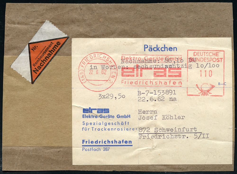 5982 | 18 € | POSTLEITRAUM 7900 (OHNE ULM) : (14b) FRIEDRICHSHAFEN 2/ Elektro-Geräte GmbH/ eiras.. 1962 (22.6.) AFS Postalia 110 Pf. auf Adreßlabel "Päckchen"-Nachnahme (Götz + 60.- DM, 1980) natürliche Falte, seltene Portostufe! (Dü.E-23 B) | ![]() | |