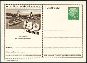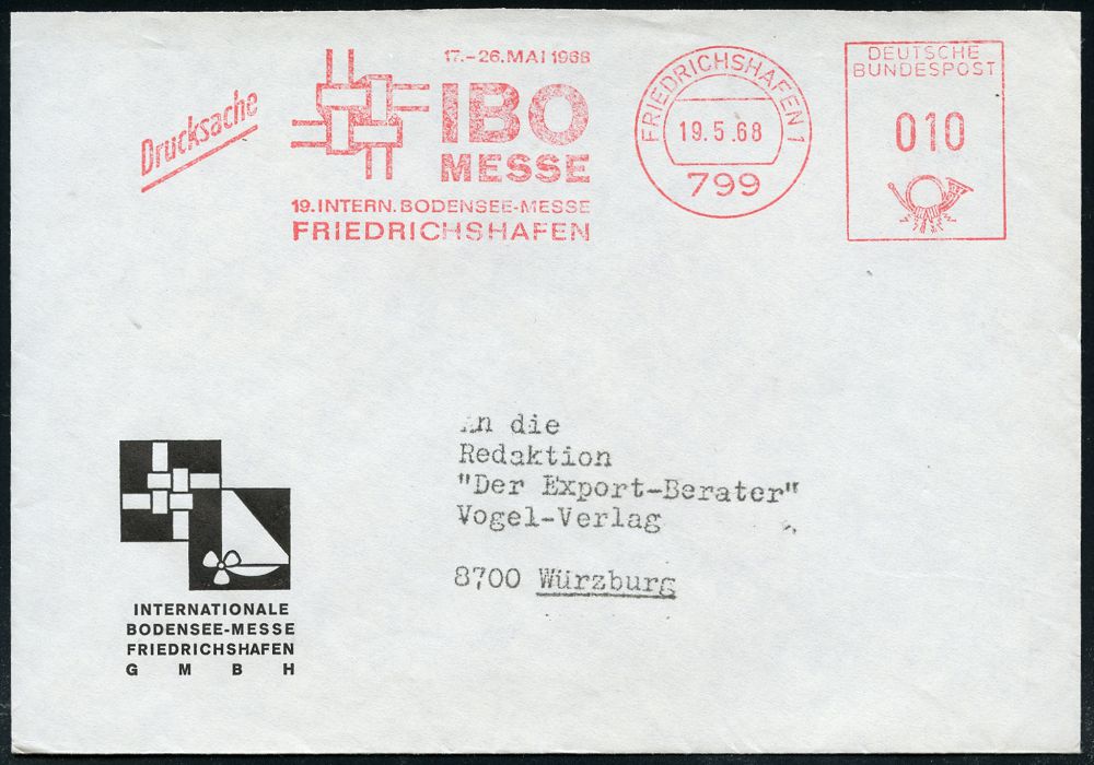 5987 | 12 € | POSTLEITRAUM 7900 (OHNE ULM) : 799 FRIEDRICHSHAFEN 1/ 17.-26. MAI 1968/ IBO/ MESSE/ 19.INTERN:BODENSEE-MESSE.. 1968 (19.5.) AFS Francotyp (Messe-Logo) motivgl. Vordruck-Bf. (rs. Klappe fehlt) der Messe-GmbH (Dü.E-26) | ![]() | |