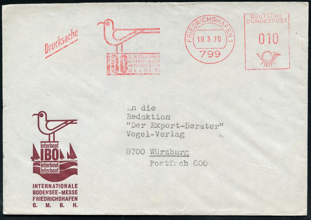 5989 | 12 € | POSTLEITRAUM 7900 (OHNE ULM) : 799 FRIEDRICHSHAFEN 1/ IBO/ 21.INTERNA:/ BODENSEE-MESSE.. 1970 (19.3.) AFS Francotyp (Möwe) motivgl. Meese-Bf. (rs. fehlt Klappe) (Dü.E-26) | ![]() | |