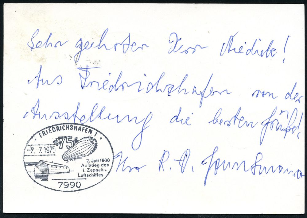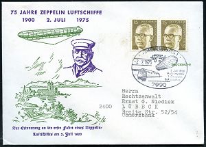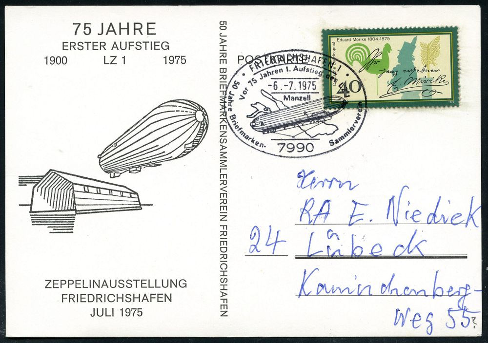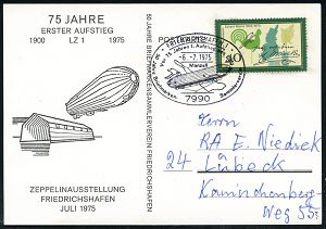 5994 | 10 € | POSTLEITRAUM 7900 (OHNE ULM) : 7990 FRIEDRICHSHAFEN 1/ Vor 75 Jahren 1.Aufstieg des LZ 1.. 1975 (6.7.) SSt (Zeppelin LZ 1) klar auf Sonder-Kt. "LZ 1", Bedarf | ![]() ![]() | |