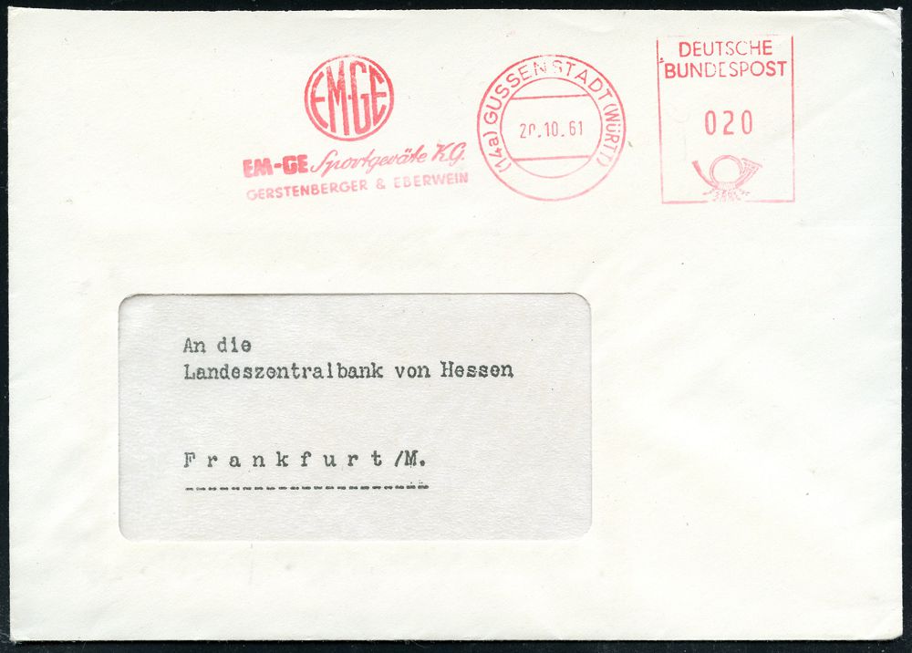 6016 | 10 € | POSTLEITRAUM 7900 (OHNE ULM) : (14a) GUSSENSTADT (WÜRTT)/ EM-GE Sportgeräte KG/ GERSTENBERGER & EBERWEIN 1961 (Okt) AFS Postalia (Monogr.-Logo) Inl.-Bf. (Dü.E-26 B) | ![]() | |