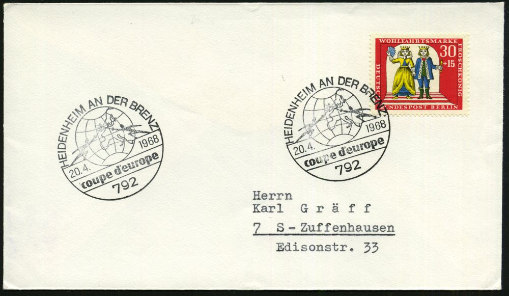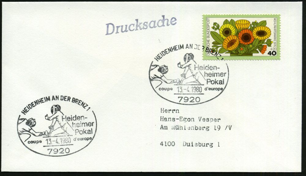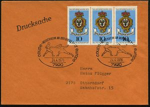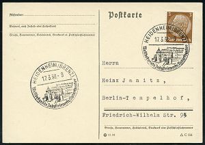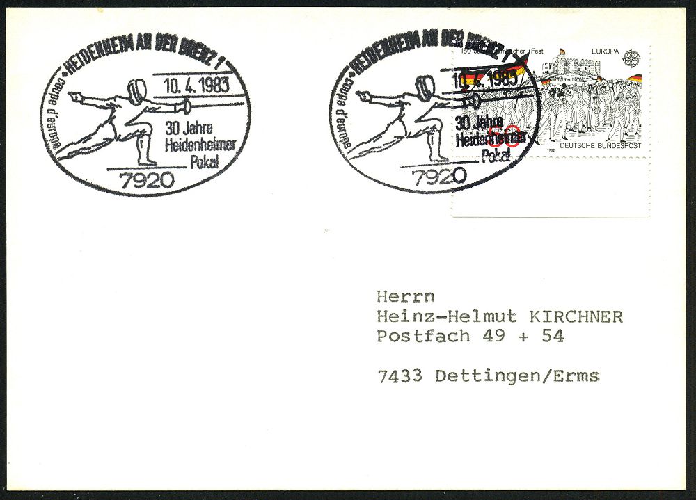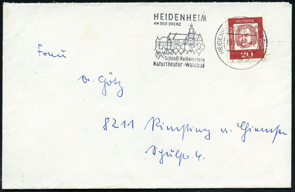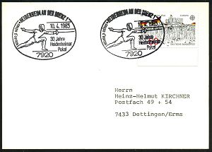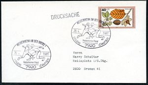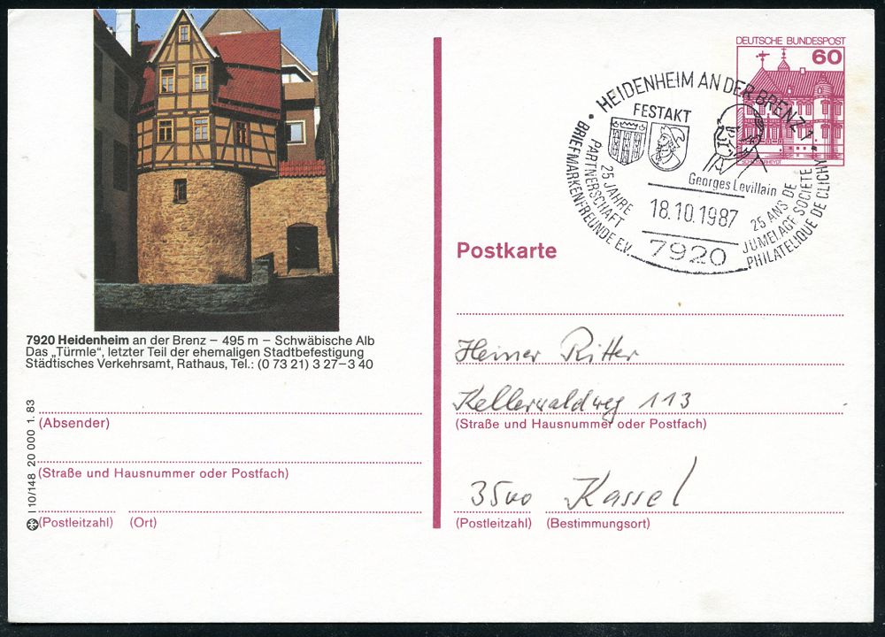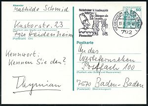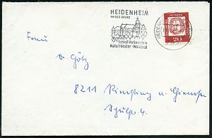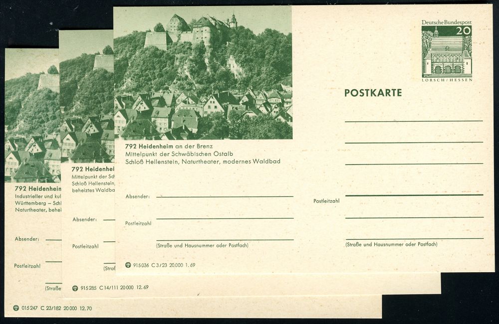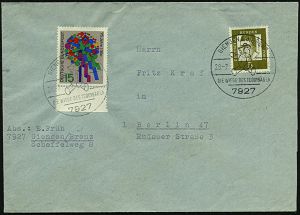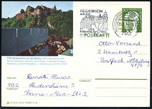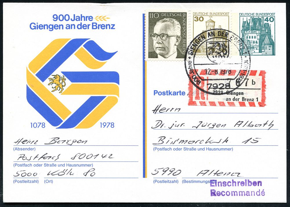 6011 | 15 € | POSTLEITRAUM 7900 (OHNE ULM) : 7928 GIENGEN AN DER BRENZ/ 900 Jahre.. 1978 (12.8.) SSt (Wappen mit Einhorn) auf passender, motivgl. PP 40 Pf. Burg Eltz + Zusatz-Frankatur + RZ: 7928 Giengen/ an der Brenz 1/b, Inl.-R-Karte (Bo.8, nur 12.-19.8.) | ![]() | |