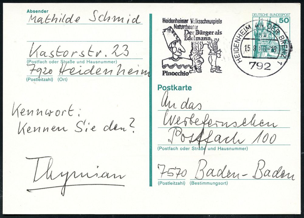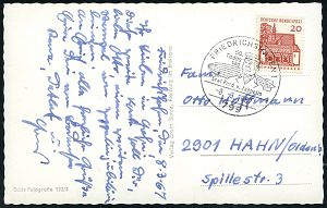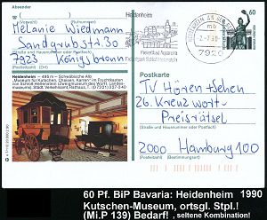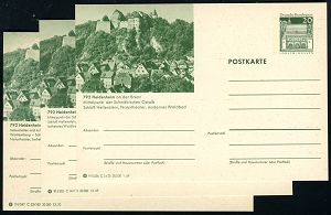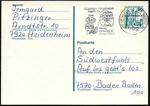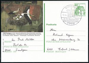 6118 | 14 € | POSTLEITRAUM 7900 (OHNE ULM) : 7968 SAULGAU/ an der Barockstrasse.. 1982 (5.4.) HWSt (Kirchturm) auf ortsgleicher BiP 50 Pf. Inzlingen, grün: 7968 Saulgau an der Barockstraße.. (Mi.P 134, = Storchennest) Inl.-Karte, seltene Kombination! (Bo.10 Ty.I = ohne Postamt-Ziffer "1") | ![]() | |