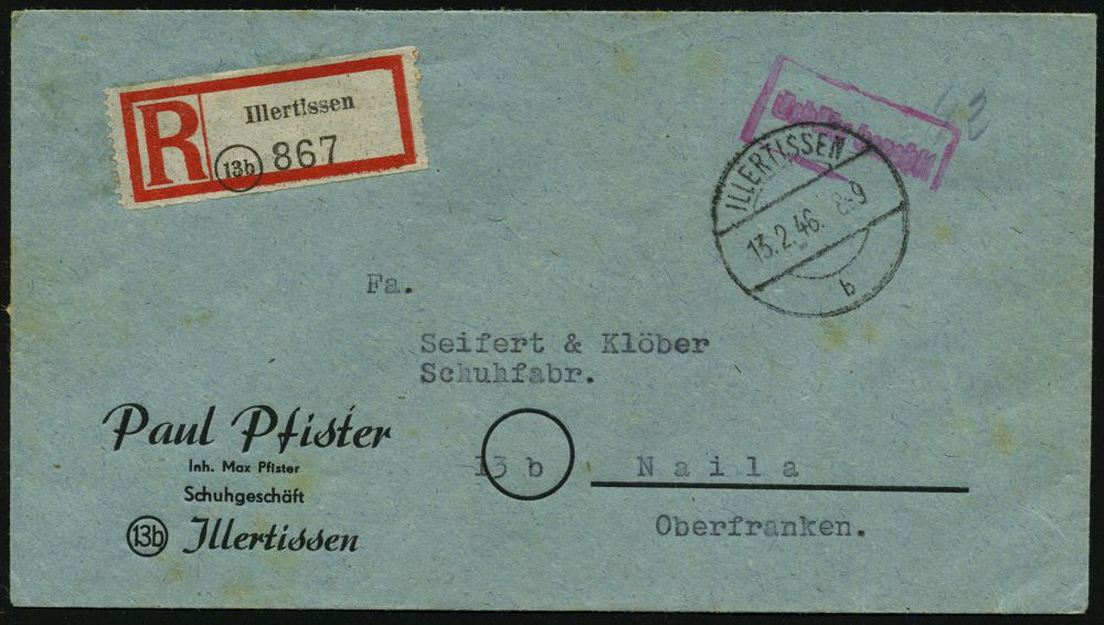 6049 | 14 € | POSTLEITRAUM 7900 (OHNE ULM) : ILLERTISSEN/ b 1946 (13.2.) 1K-Brückeg + roter Ra.: Gebühr bezahlt + RZ: (13 b) Illertissen , klar gest. Fern-R-Bf. | ![]() | |
