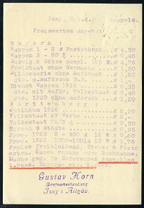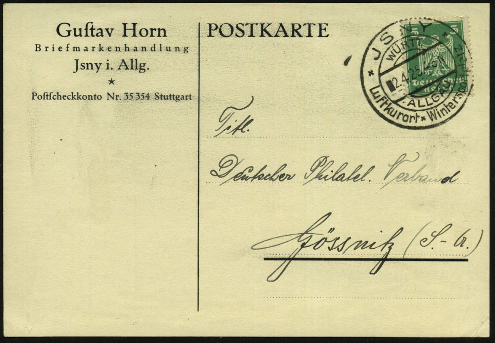 6052 | 16 € | POSTLEITRAUM 7900 (OHNE ULM) : JSNY/ +WÜRTT.+/ ALLGÄU/ Luftkurort-Wintersportplatz 1925 (2.4.) HWSt klar auf Firmenkt.: Gustav Horn.. mit Preisliste (Bo.1) | ![]() ![]() | |