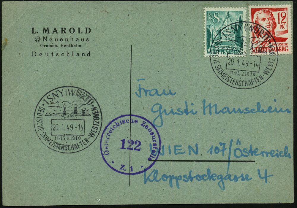 6056 | 20 € | POSTLEITRAUM 7900 (OHNE ULM) : ISNY (WÜRTT)/ DEUTSCHE SKIMEISTERSCHAFTEN-WESTZONEN 1949 (20.1.) SSt + sowjet. Eingangs-Zensur, viol. 1K: Österr. Zensurstelle/Z.1 (= Wien) klar gest. Ausl.-Zensur-Kt. n. Wien (Bo.3) | ![]() | |