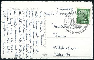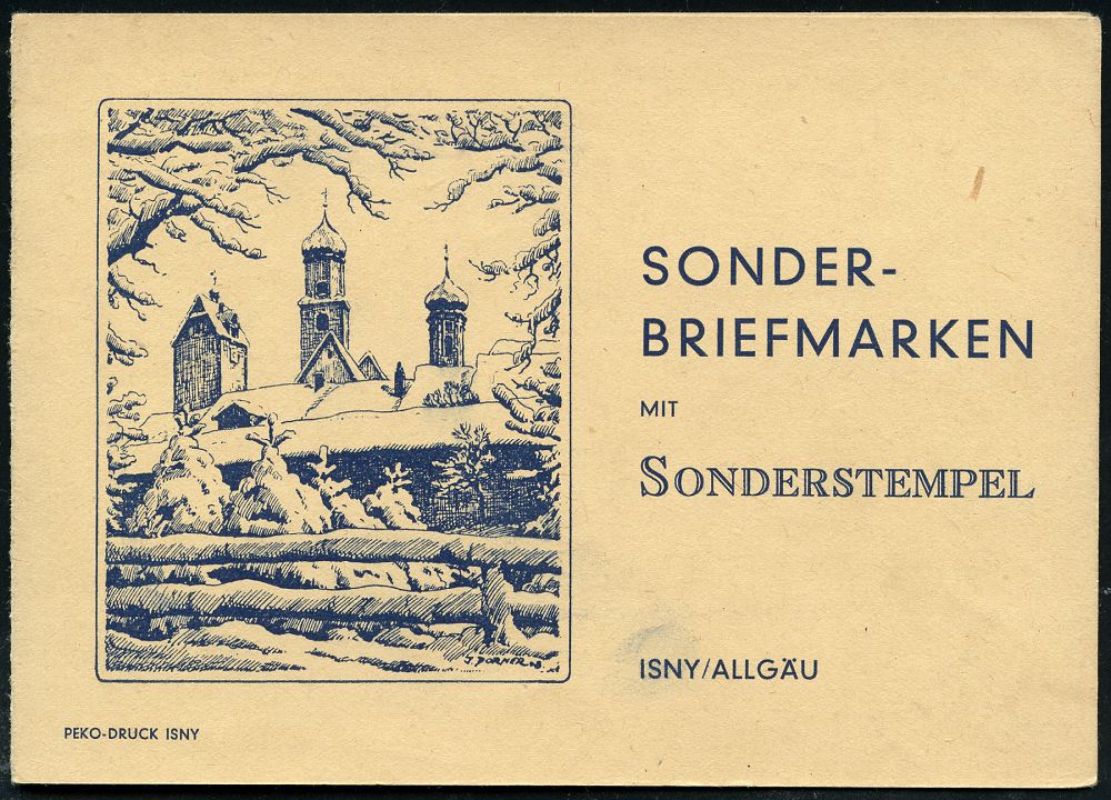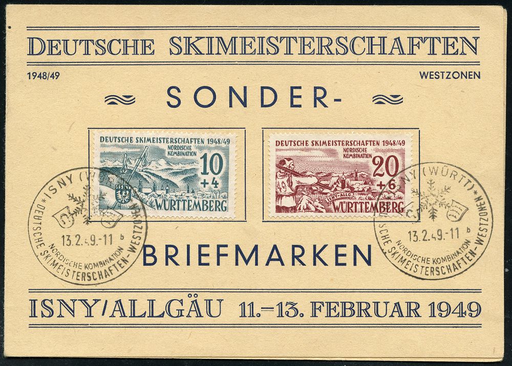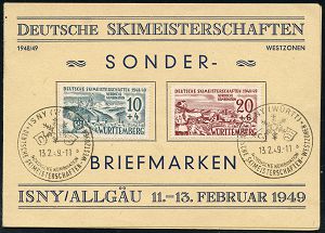 6057 | 35 € | POSTLEITRAUM 7900 (OHNE ULM) : ISNY (WÜRTT)/ a/ NORD.KOMBINATION/ DEUTSCHE SKIMEISTERSCHAFTEN-WESTZONEN 1949 (13.2.) SSt auf kompl. Satz "Deutsche Nordische Skimeisterschaften" (Mi. 38/39 x, nur Markenwert + 60.-EUR) klar gest. Gedenk-Klappkarte (Bo.4 a) | ![]() ![]() | |