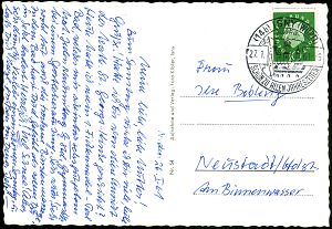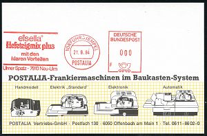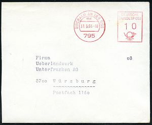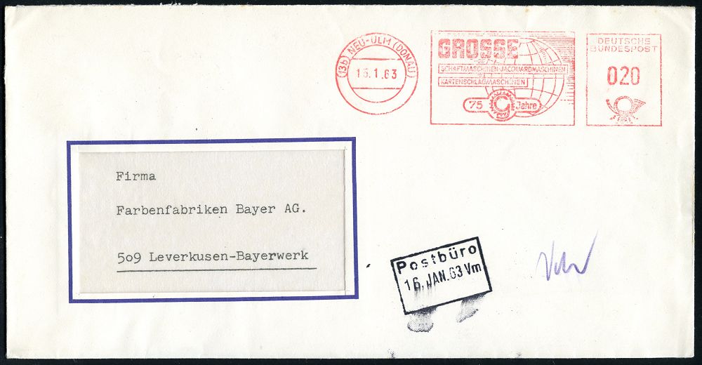 6087 | 14 € | POSTLEITRAUM 7900 (OHNE ULM) : (13b) NEU-ULM (DONAU)/ GROSSE/ SCHAFTMASCHINEN JACQUARD../ KARTENSCHLAGMASCHINEN / 75 Jahre 1963 (15.1.) Jubil.-AFS Francotyp (Logo, Globus) rs. Abs.-Vordruck, Fern-Bf. (E-23CO späte, alte PLZ!) | ![]() ![]() | |