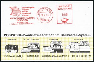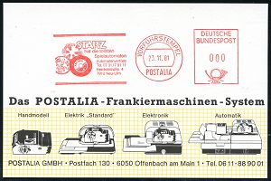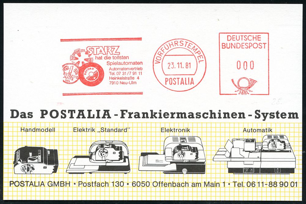 6090 | 18 € | POSTLEITRAUM 7900 (OHNE ULM) : 7910 Neu-Ulm 1981 (23.11.) AFS: VORFÜHRSTEMPEL/POSTALIA/STARZ/hat d.tollsten/Spielautomaten.. 2 Jetons/1.- DM) aseltene Postalia- Musterkt.! (= Specimen) | ![]() | |