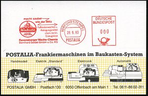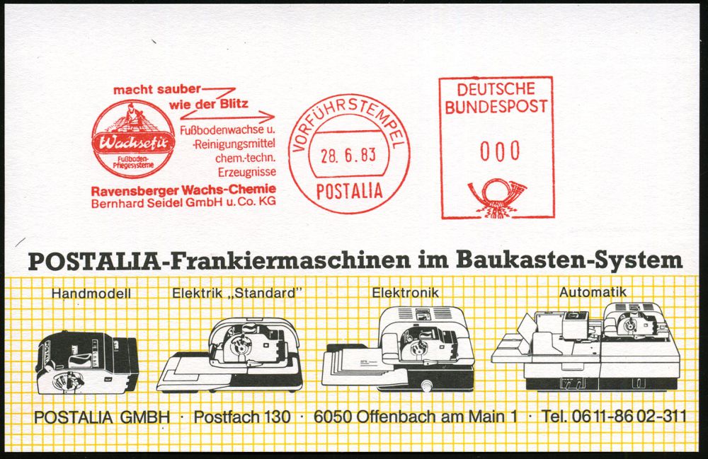 6107 | 18 € | POSTLEITRAUM 7900 (OHNE ULM) : Ravensburg 1983 (28.6.) AFS: VORFÜHRSTEMEPL/POSTALIA/Wachsefaix/macht sauber/wie d.Blitz../Ravensburger Wachs-Chemie/Bernh.Seidel.. (Hausfrau m.Bohnergerät) seltene Postalia-Musterkt. (= Specimen) | ![]() | |