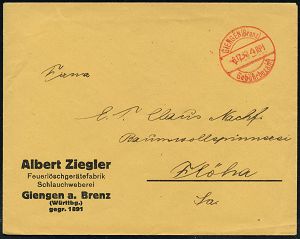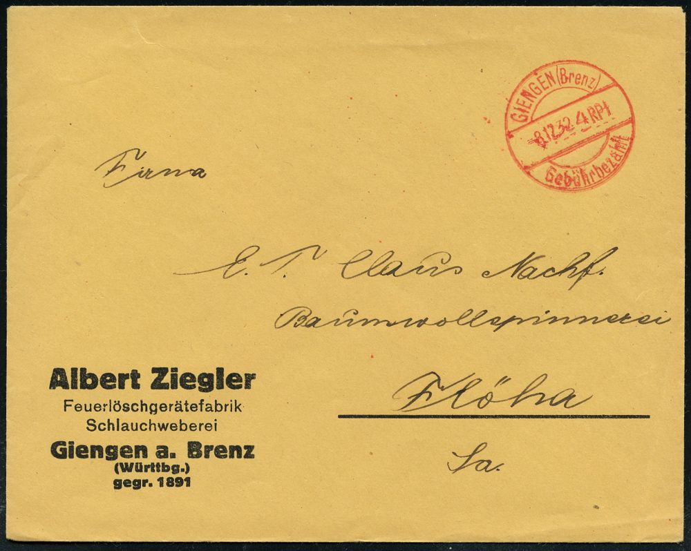 6005 | 15 € | POSTLEITRAUM 7900 (OHNE ULM) : GIENGEN (Brenz)/ Gebühr bezahlt 1932 (8.12.) 1K-Brücken-PFS 4 Rpf (ohne Uhrzeit) Firmen-Bf.: Albert Ziegler, Feuerlöschgerätefabrik, Schlauchweberei.. (Dü.A-6, Nr.25) | ![]() | |