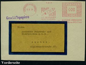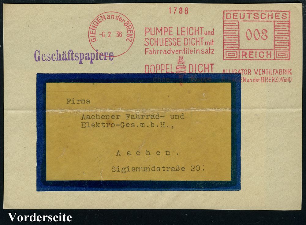 6006 | 25 € | POSTLEITRAUM 7900 (OHNE ULM) : GIENGEN an der BRENZ/ PUMPE LEICHT und/ SCHLIESSE DICHT mit/ Fahrradventileinsatz/ ..ALLGATOR VENTILFABRIK 1934/36 2 verschiedene AFS Francotyp "Mäanderrechteck" (Motiv; je Fahrradschlauch-Ventil) 2 Bedarfs-Vorderseiten, 2 Belege (Dü.E-2CEh) | ![]() ![]() | |