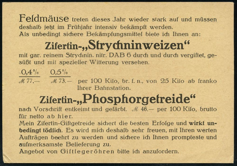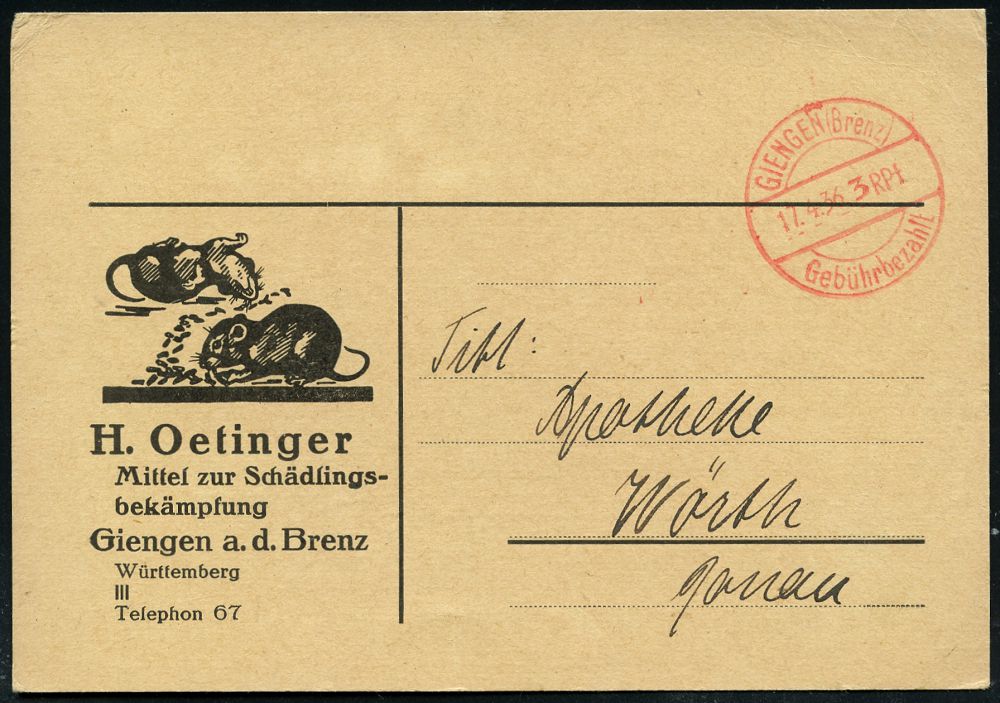6007 | 18 € | POSTLEITRAUM 7900 (OHNE ULM) : GIENGEN (Brenz)/ Gebühr bezahlt 1936 (17.4.) 1K-Brücken-PFS 3 RPf auf Reklame-Kt.: H. Oetinger, Mittel zur Schädlingsbekämpfung.. (fressende u. tote Feldmaus) für Strychninweizen u. Phosporgetreide (Dü.A-5, Nr.25) | ![]() ![]() | |