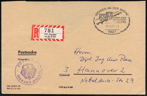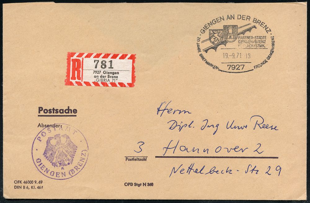 6010 | 20 € | POSTLEITRAUM 7900 (OHNE ULM) : 7927 GIENGEN AN DER BRENZ/ PARTNER-STÄDTE/ GIENGEN../ KÖFLACH.. 1971 (19.9.) SSt (Brücke, 2 Wappen) + Sonder-RZ: 7927 Giengen/ an der Brenz/"GIBRIA 71" (NEZ-Kat.Nr.181) + viol. 1K-HdN: POSTAMT/a/GIENGEN (BRENZ) (Bf. fehlt rs. Klappe) Inl.-Postdienst-R-Bf. (Bo.4, nur 18.9.-19.9.) | ![]() | |