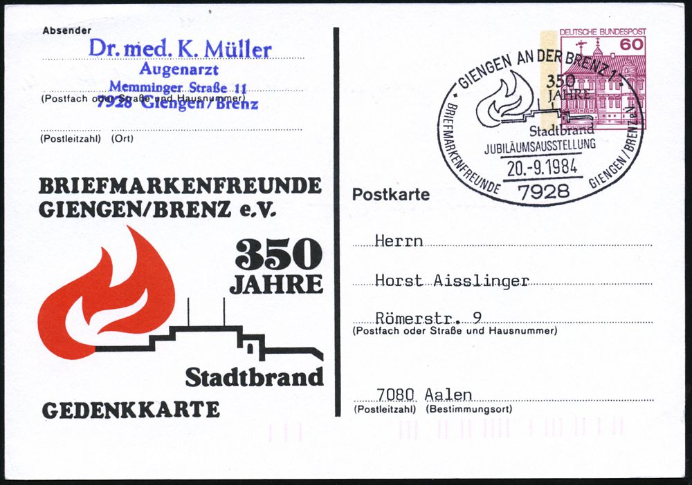 6013 | 14 € | POSTLEITRAUM 7900 (OHNE ULM) : 7928 GIENGEN AN DER BRENZ 1/ 350 JAHRE/ Stadtbrand.. 1984 (20.9.) SSt = flammendes Dach , motivgl. PP 60 Pf. Burgen: 350 JAHRE Stadtbrand.., Bedarf (Mi.PP 106/22) | ![]() | |
