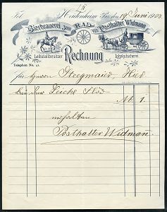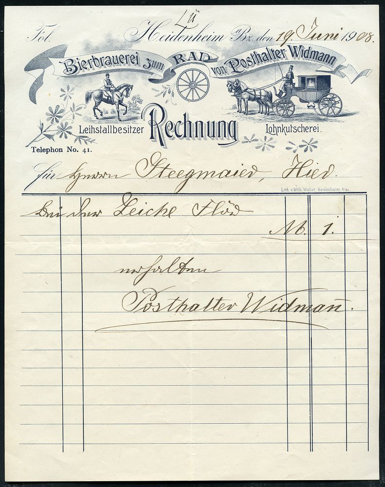 6017 | 28 € | POSTLEITRAUM 7900 (OHNE ULM) : Heidenheim/ Brenz 1908 (19.6.) illustrierte Rechnung: Bierbrauerei zum RAD bei Posthalter Widmann, Leihstallbesitzer, Lohnkutscherei (Motive: Reiter u. Pferdekutsche, Rad) sehr gute Erhaltung!, sehr dekorativ! (Format ca. A 4) | ![]() | |