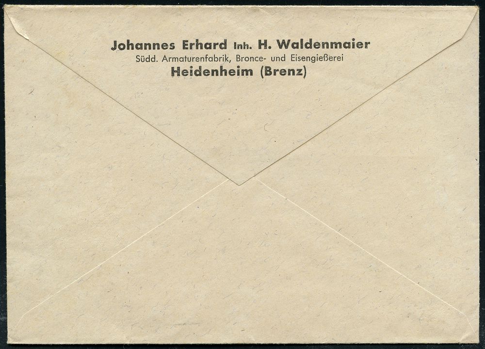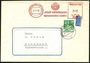 5950 | 16 € | POSTLEITRAUM 7900 (OHNE ULM) : (14a) BÖHMENKIRCH (WÜRTT)/ JHB/ JOSEF HEINZMANN.. 1950 (30.11.) AFS Postalia 10 Pf. auf 2 Pf. NoB = VE + Nachfrankatur 10 Pf. Bauten , 2K: BÖHMENKIRCH (WÜRTT)/a, da Fern-Bf., seltene MiF (Dü.E-20B + Mi.80 eg) | ![]() | |
