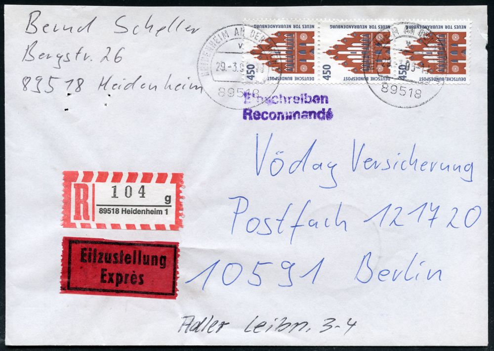 6045 | 14 € | POSTLEITRAUM 7900 (OHNE ULM) : 89518 HEIDENHEIM AN DER BRENZ 1/ v 1995 (29.3.) 1K-Segment 2x auf vertikalem 3er-Streifen 450 Pf. Neubrandenburg + RZ: 89518 Heidenheim 1/g , klar gest. Inl.-Eil-Bf. = seltene Portostufe! (Mi.1623 Me + 12.- EUR) | ![]() | |