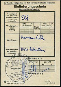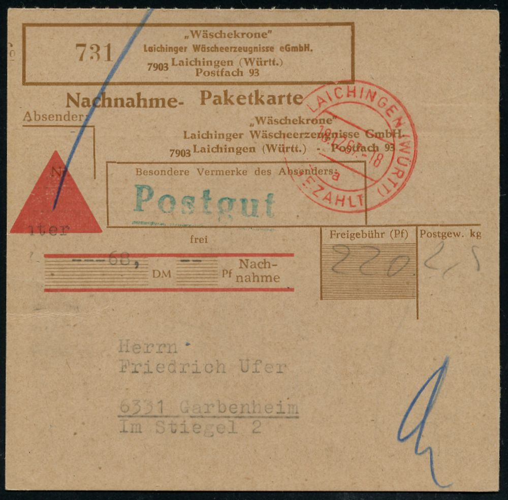 6067 | 16 € | POSTLEITRAUM 7900 (OHNE ULM) : LAICHINGEN (WÜRTT)/ a/ BEZAHLT 1967 (28.12.) aptierter 2K-Steg-PFS = alte PLGZ entfernt , Inl.-NN-Postgut-Selbstbucher-Paket-Kt.: 7903 Laichingen (Württ.) "Wäschekrone" Laichinger Wäscheerzeugnisse eGmbH n. Garbenheim (Dü.A-7, Nr.32 aptiert) | ![]() | |