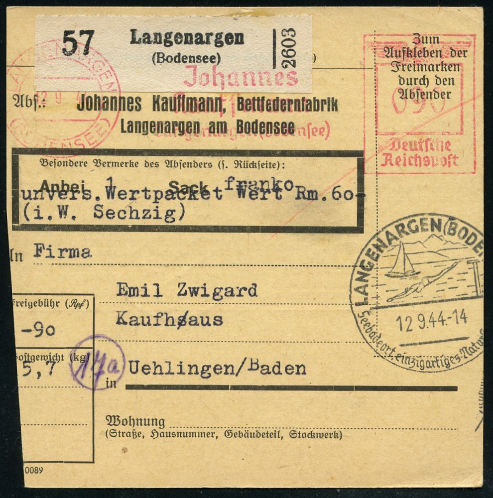 6068 | 25 € | POSTLEITRAUM 7900 (OHNE ULM) : LANGENARGEN/ (BODENSEE)/ Johannes/ Kauffmann.. 1944 (12.9.) AFS Francotyp "Reichsadler" 090 Pf. + schw. Paketzettel: Langenargen/ (Bodensee) + HWSt.: LANGENARGEN (BODENSEE)/Seebadeort.. (rechts nicht ganz voll) Inl.-Wert-Paket-Kt. (Bettfedernfabrik) n. Uehlingen, seltene Portostufe! (Dü.E-5CEo) | ![]() ![]() | |