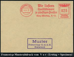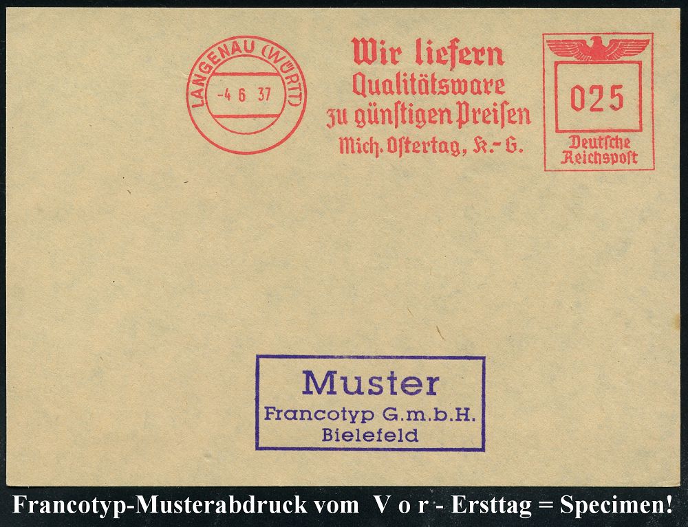6069 | 35 € | POSTLEITRAUM 7900 (OHNE ULM) : LANGENAU (WÜRTT)/ Wir liefern/ Qualitätsware7zu günstigen Preisen/ Mich.Ostertag KG 1937 (4.6.) AFS-Musterabdruck Francotyp "Reichsadler" , glasklar gest. Francotyp-Musterblatt vom V o r - Ersttag ! (mit Attest), selten! (Dü.E-5CGo) | ![]() ![]() | |