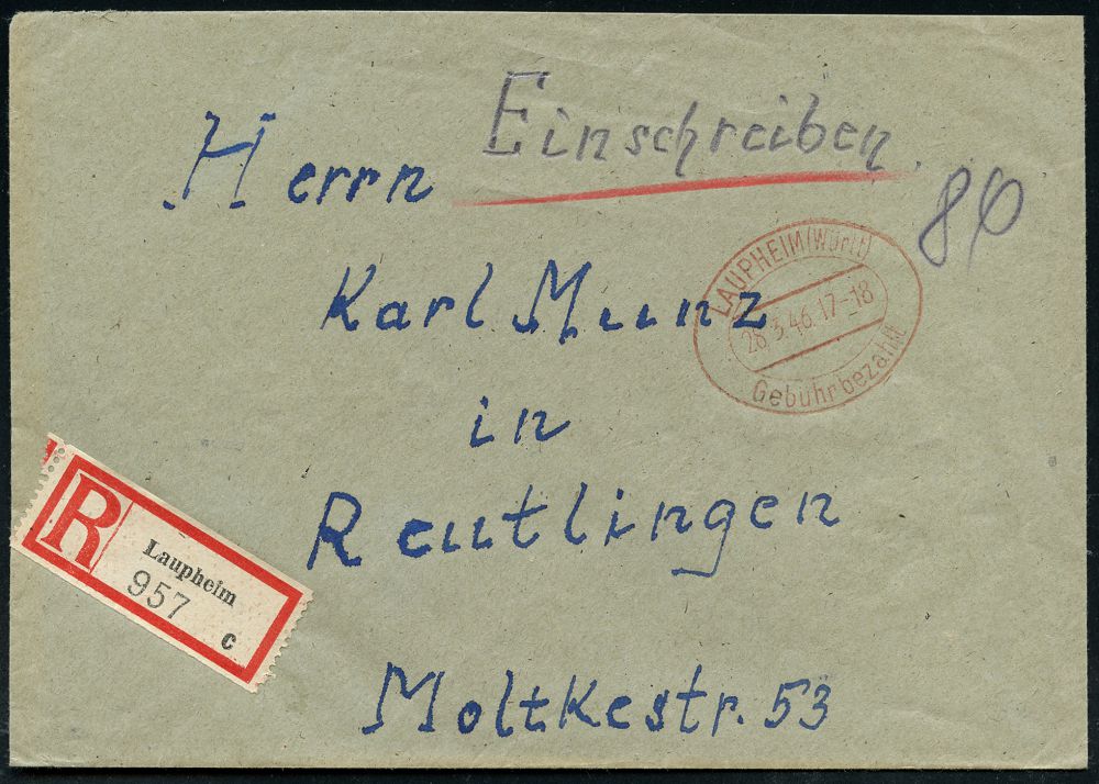 6070 | 14 € | POSTLEITRAUM 7900 (OHNE ULM) : LAUPHEIM (Württ)/ Gebühr bezahlt 1946 (28.3.) Doppel-Oval-PFS mit Uhrzeit + RZ: Laupheim/c , klar gest. Fern-R-Bf. n. Reutlingen (Dü.A-5, Nr.20 b) | ![]() ![]() | |