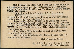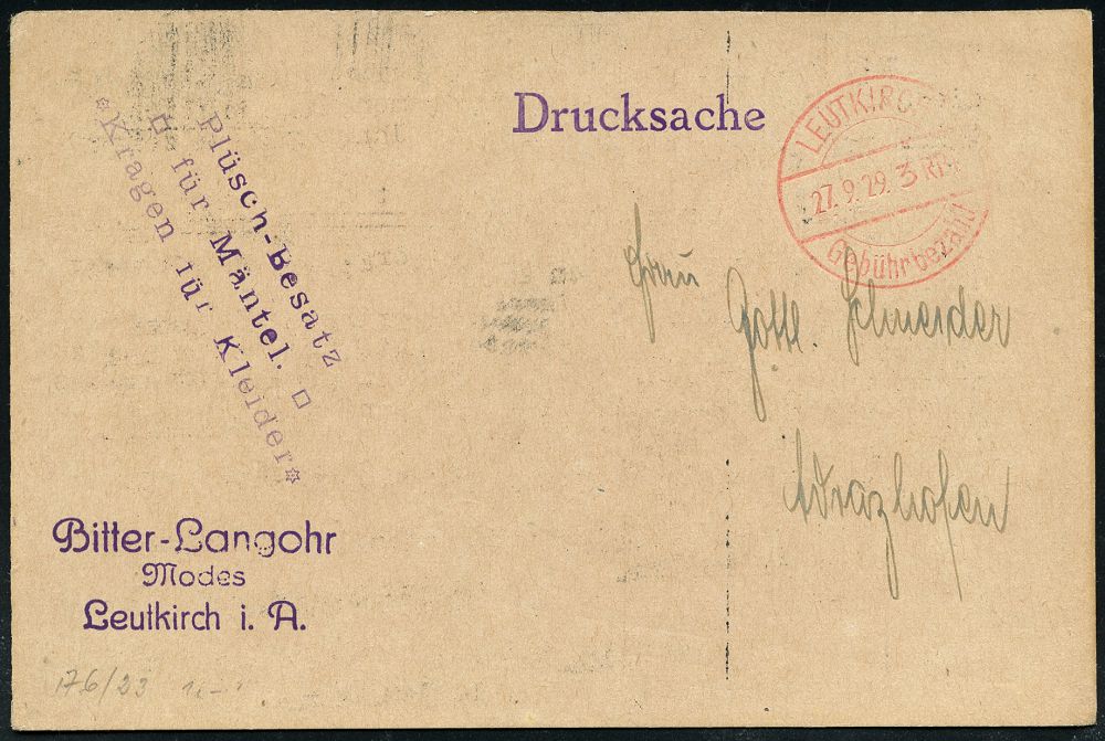 6072 | 15 € | POSTLEITRAUM 7900 (OHNE ULM) : LEUTKIRCH/ Gebühr bezahlt 1929 (27.9.) 1K-Brücken-PFS 3 RPf auf Firmen-Kt.: Bitter-Langohr Modes..über Modellhutausstellung (Dü.A-6, Nr.25) | ![]() ![]() | |